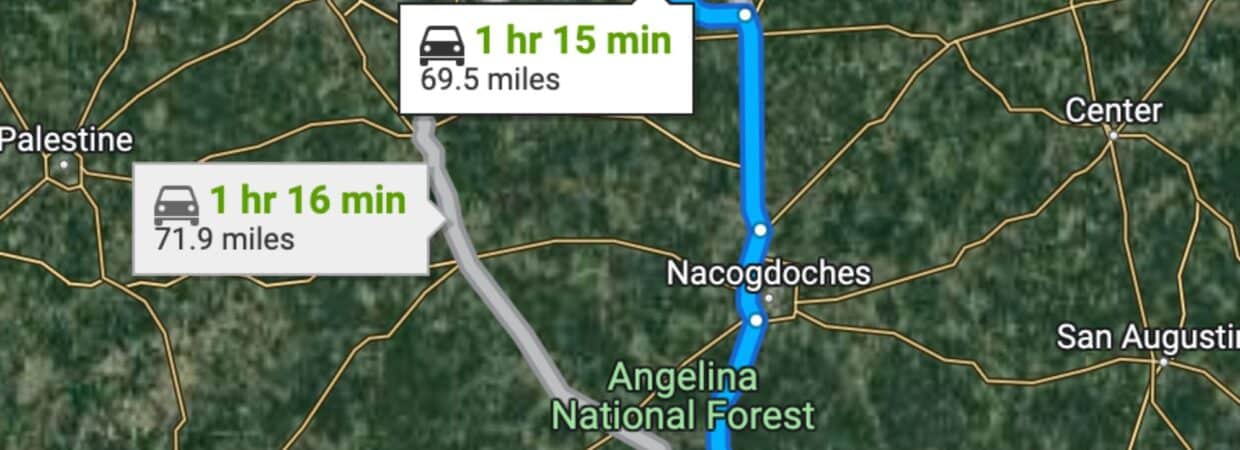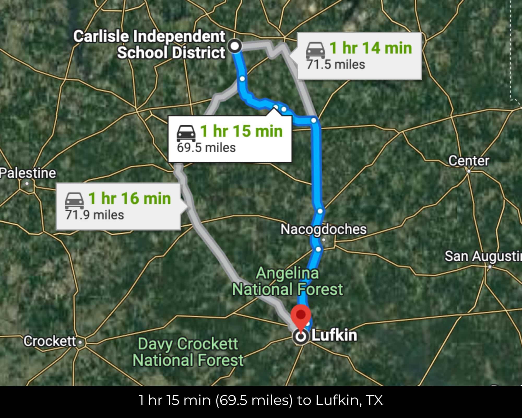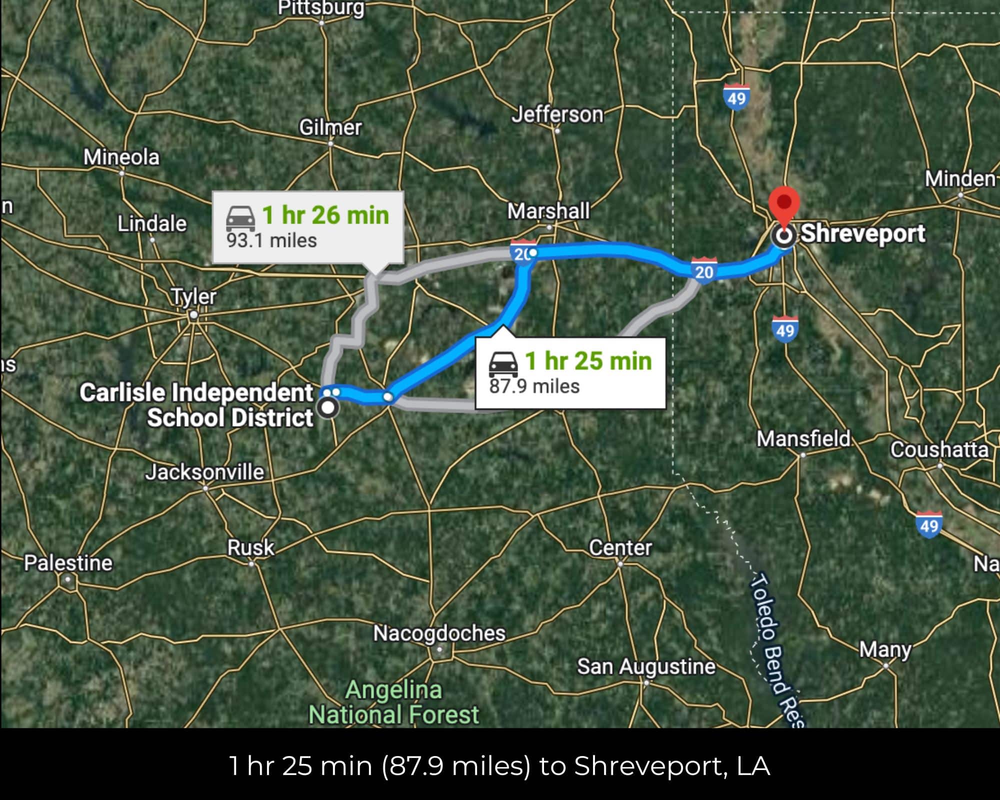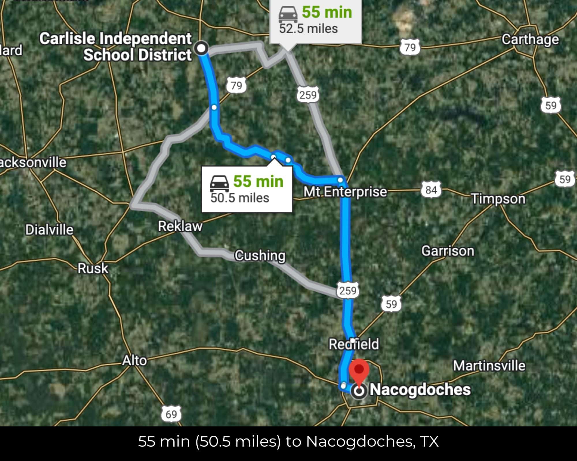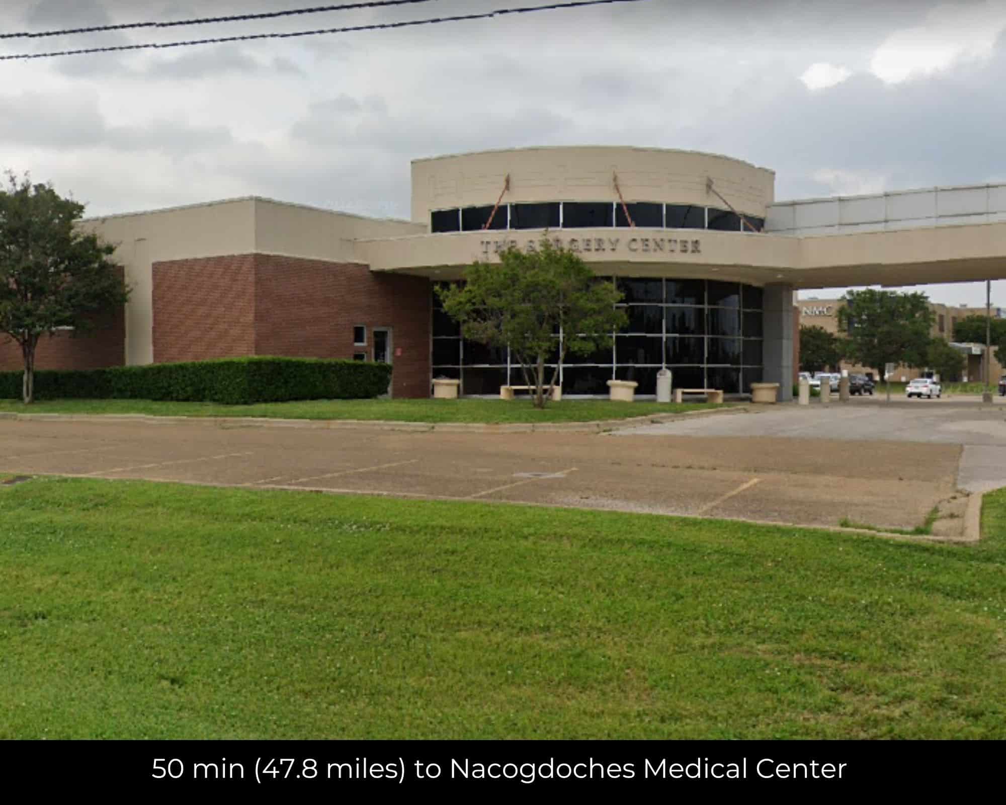 50 min (47.8 miles) to Nacogdoches Medical Center (about)