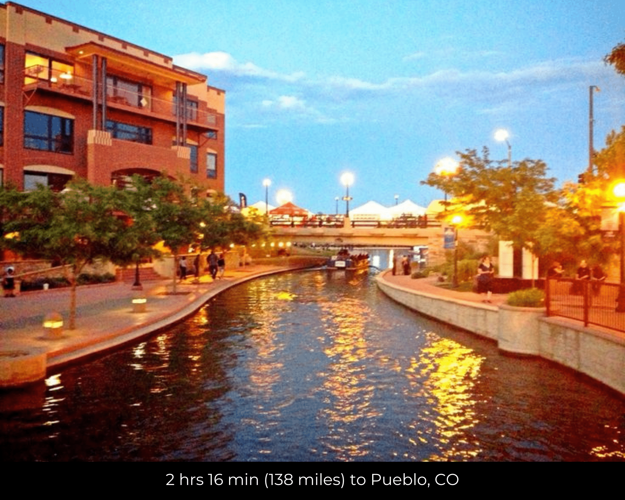 - 2 hr 15 min (138 miles) to Pueblo, CO (about)