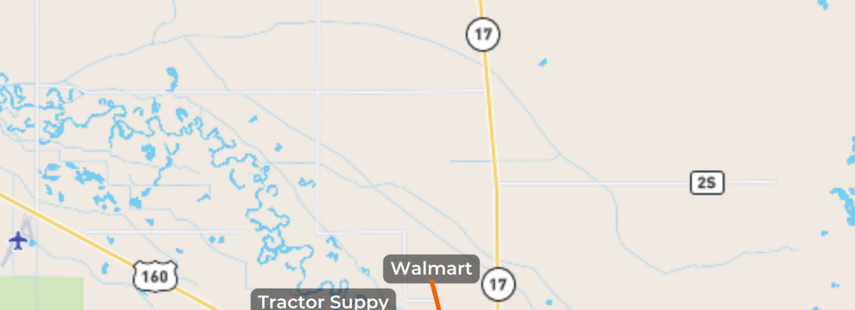 1.0 mi,Turn left at the 1st cross street onto Lane 5 N 3.2 mi, Turn right onto CO-17n 12.1 mi, Turn right onto US-160 W/Broadway Ave, Continue to follow US-160 W 0.4 mi, Turn right onto Fourth St 0.4 mi, Turn right onto Ross Ave