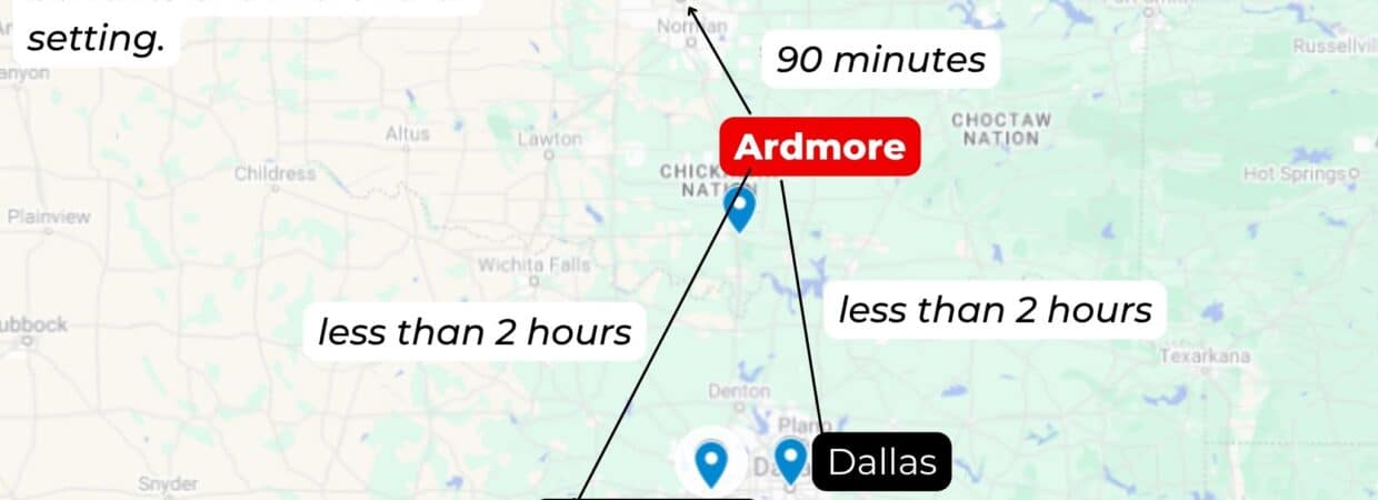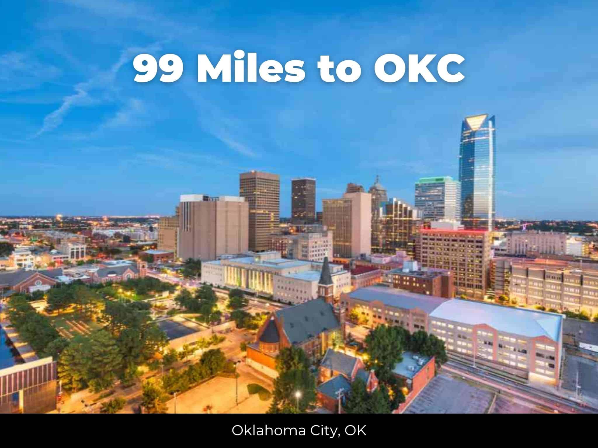 - 90 minutes (98 miles) to Oklahoma City, OK