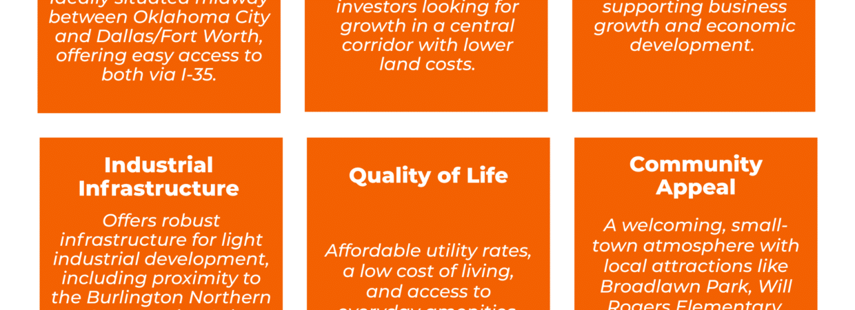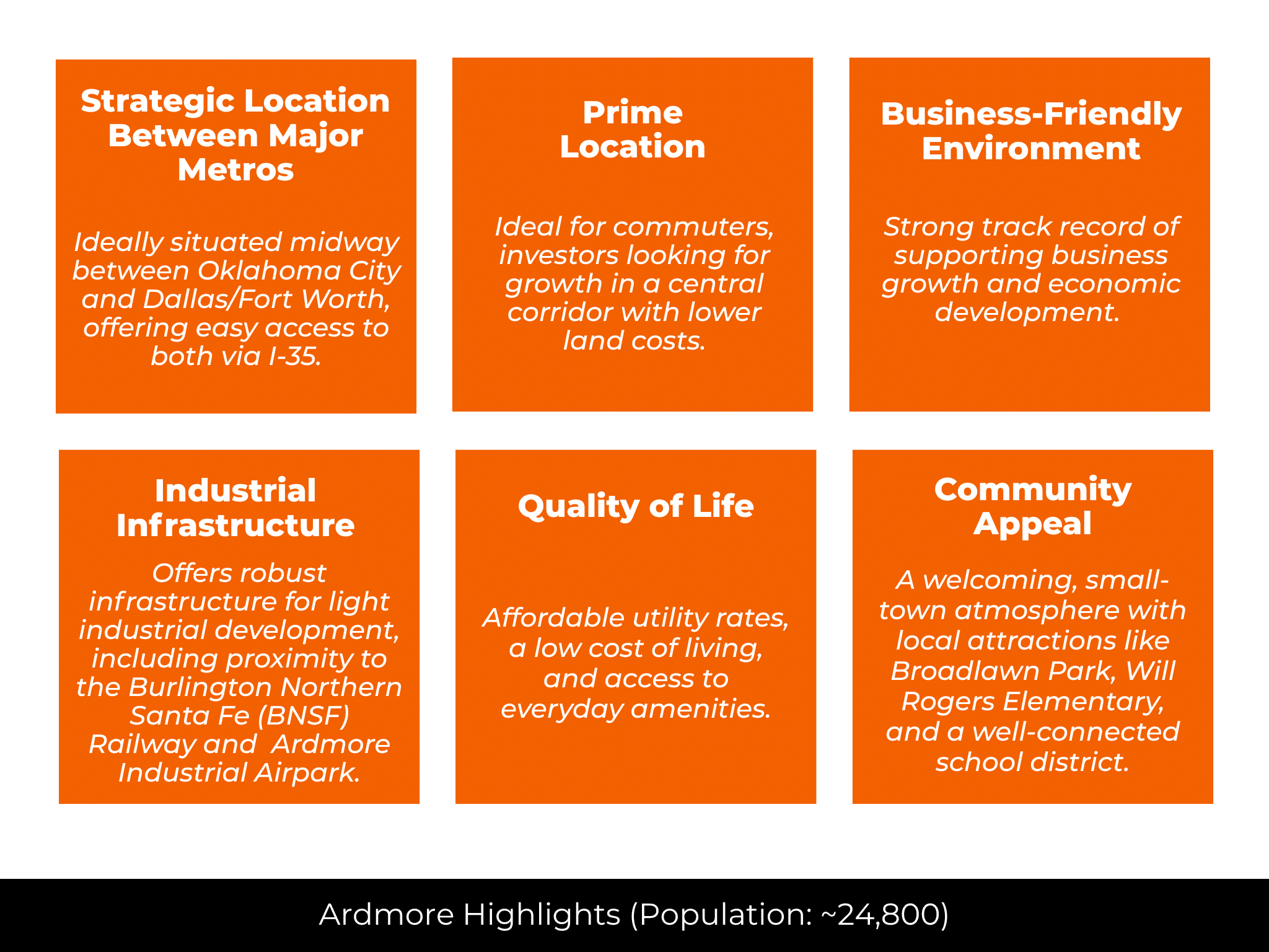 With easy access to the Burlington Northern Santa Fe Railway, major thoroughfares, and downtown Ardmore (less than 10 minutes away), the location supports a wide range of uses. Positioned just 90 minutes from Oklahoma City and under 2 hours to Dallas–Fort Worth, it also offers excellent regional connectivity.