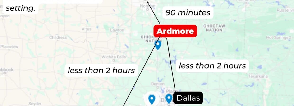 - 90 minutes (98 miles) to Oklahoma City, OK
