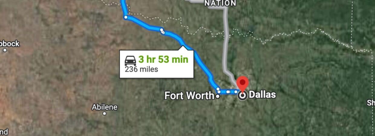3 hr 48 min (236 miles) to Dallas, Texas (about)