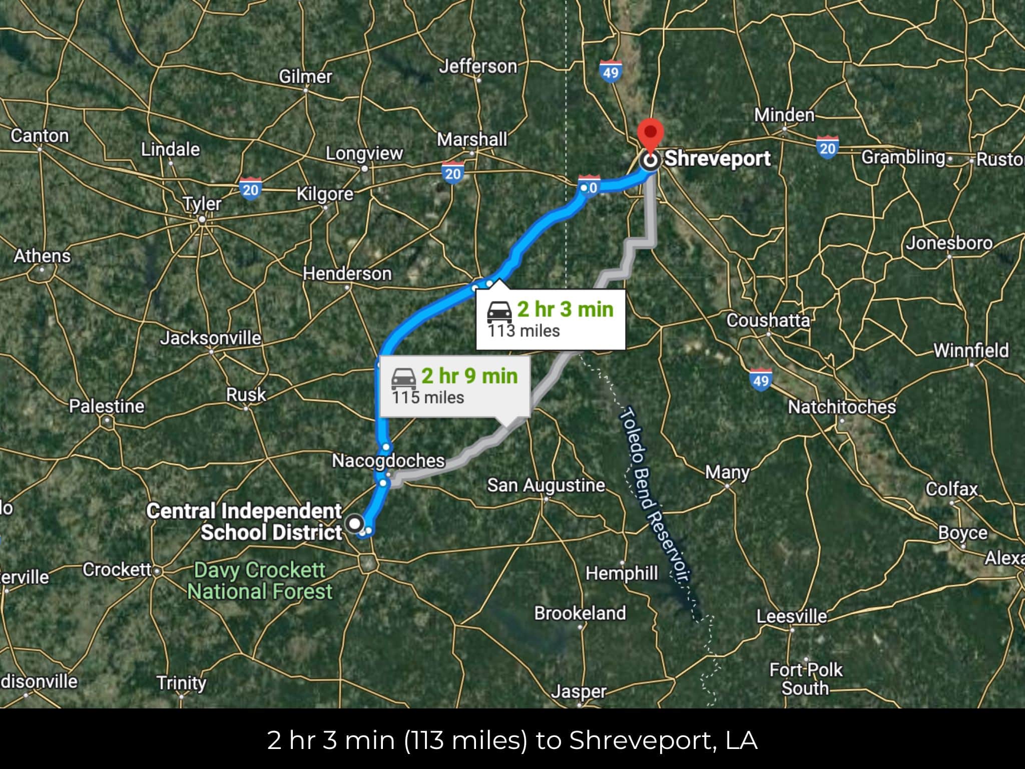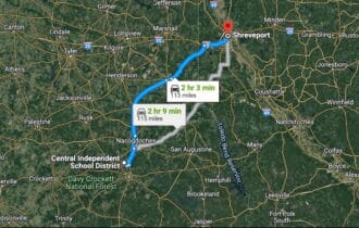 2 hr 3 min (113 miles) to Shreveport, LA (about)