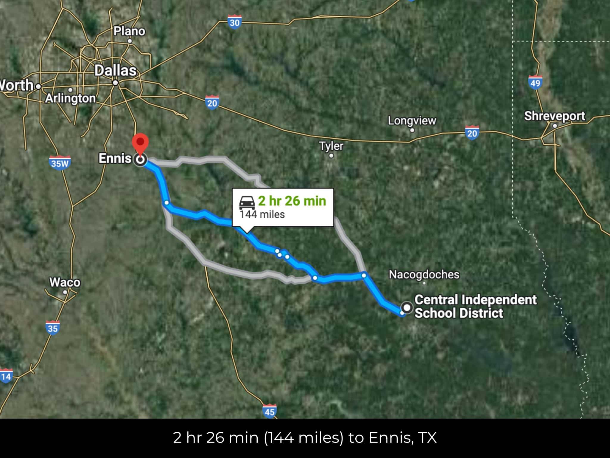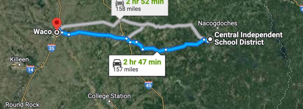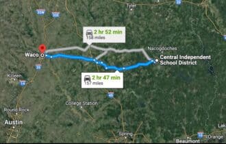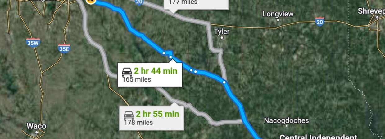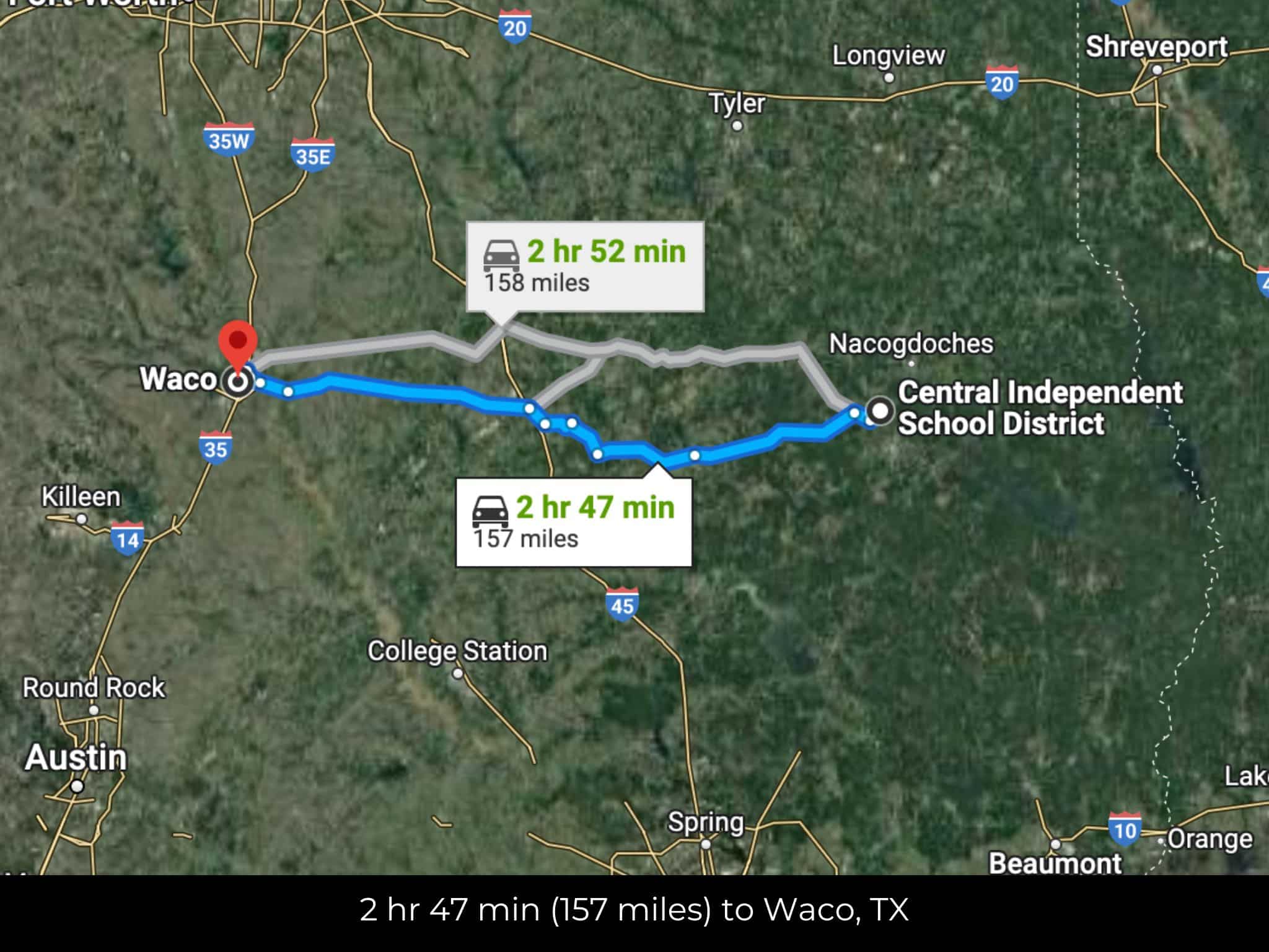 2 hr 47 min (157 miles) to Waco, TX (about)