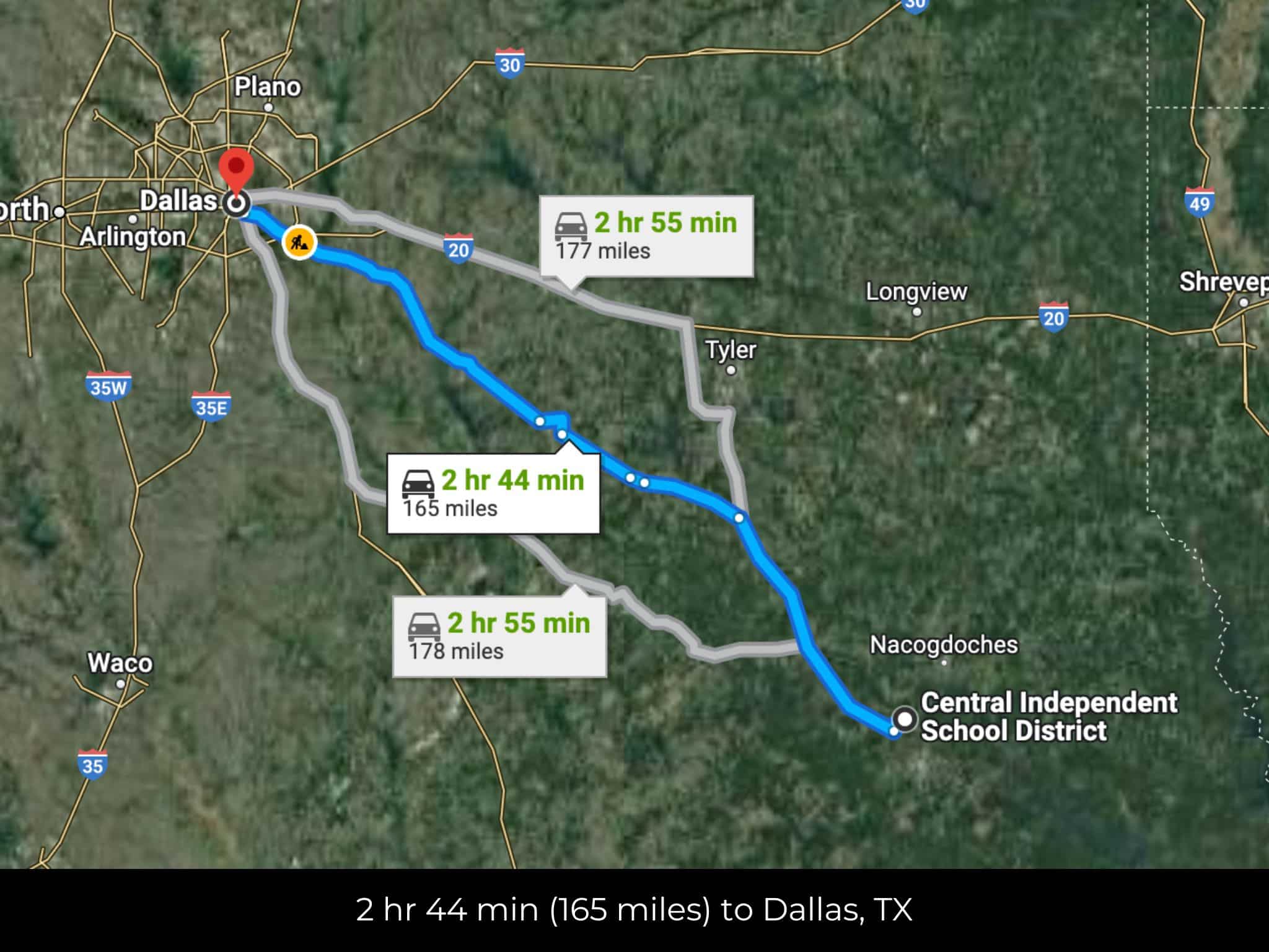 2 hr 44 min (165 miles) to Dallas, TX (about)