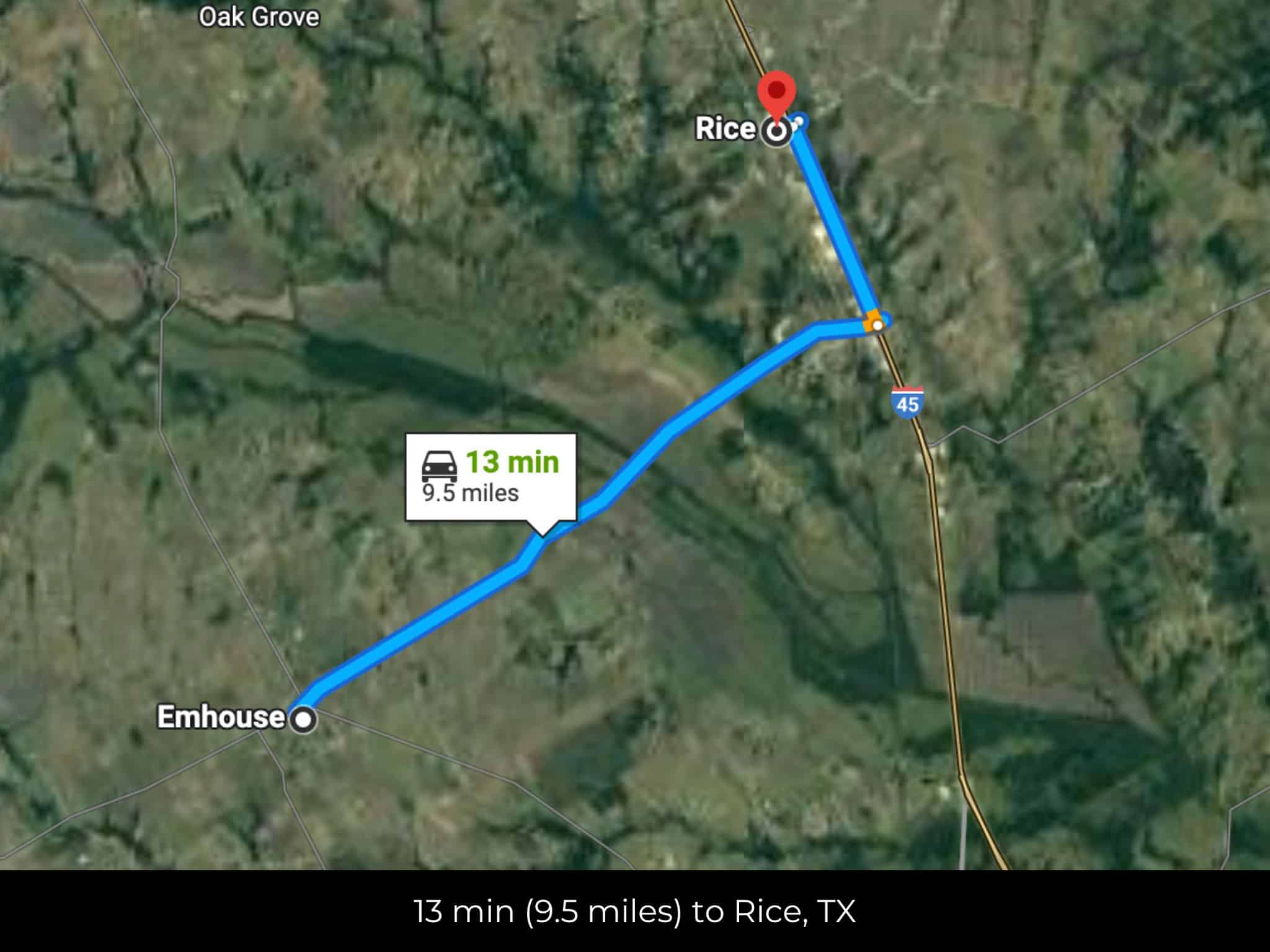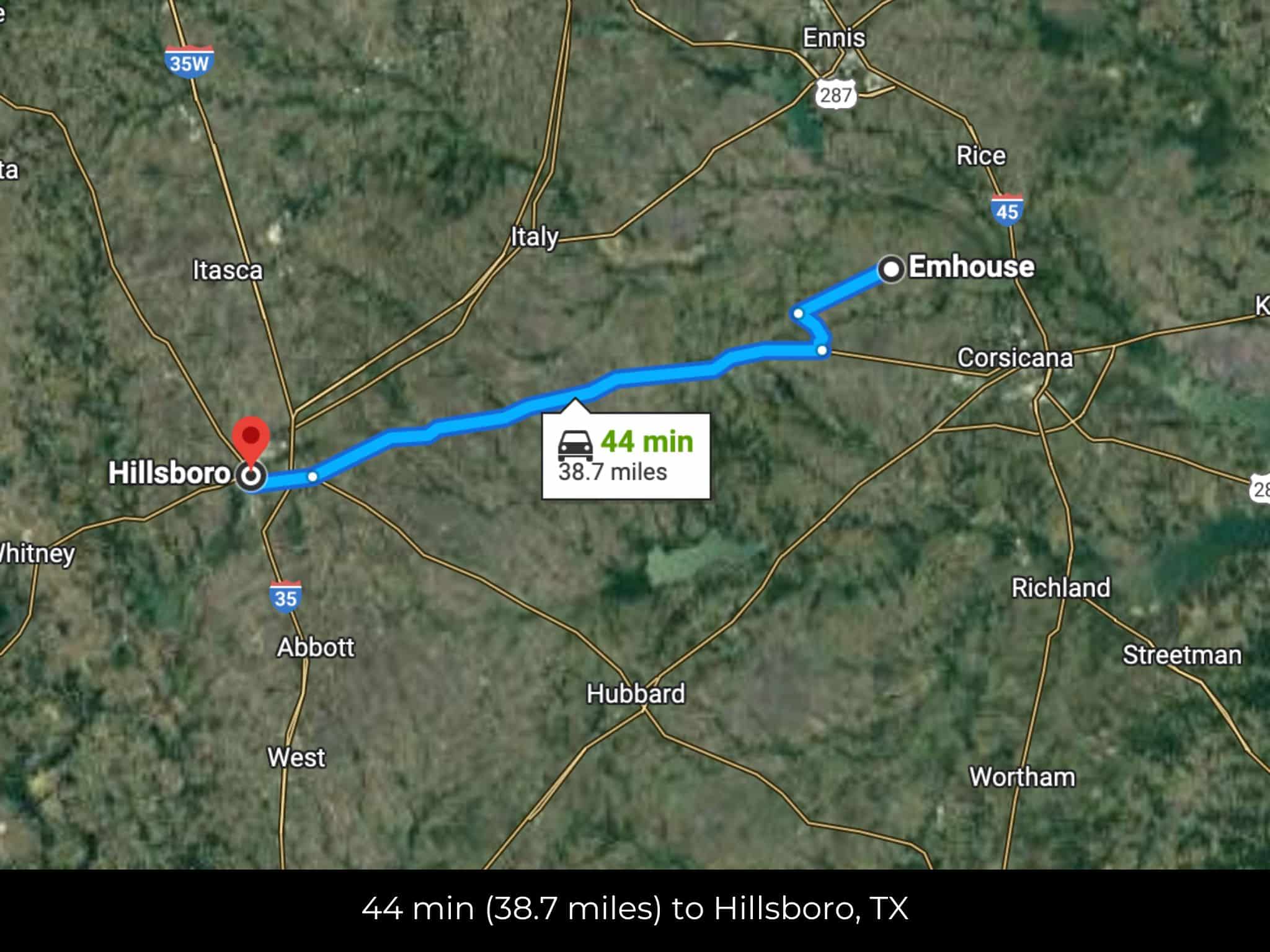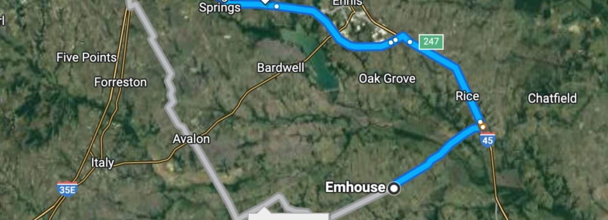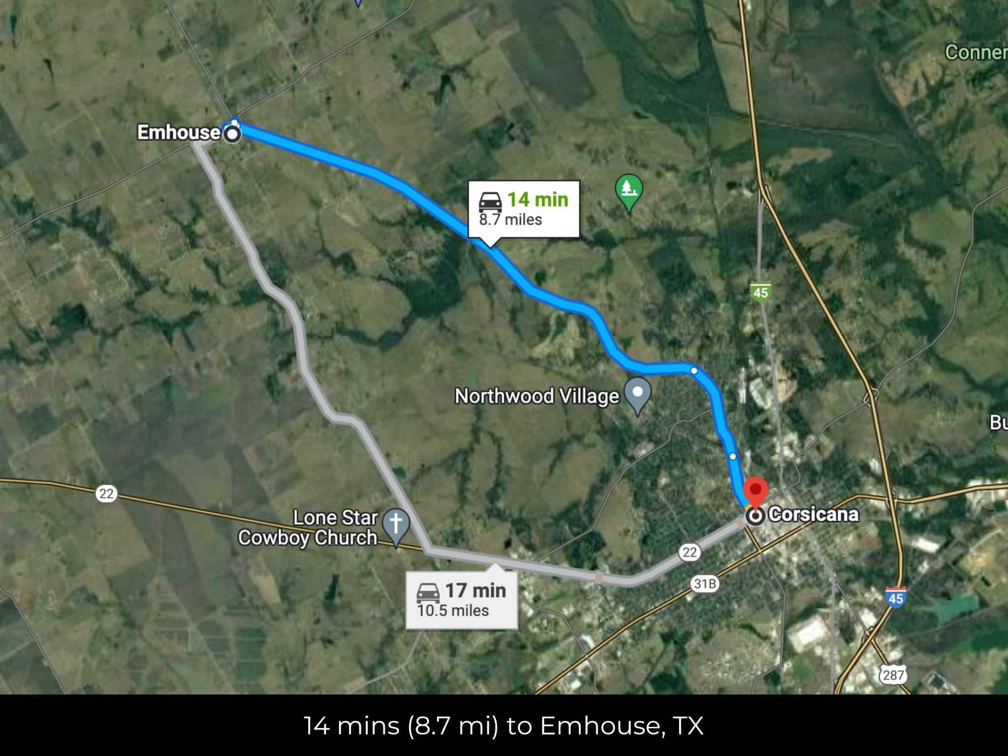 🚗 Driving Directions: Head northwest on S Chambers Ave toward W Olive St 23 sec (482 ft), Take Emhouse Rd to W 2nd Ave in Corsicana 13 min (8.6 mi), Continue on W 2nd Ave to your destination