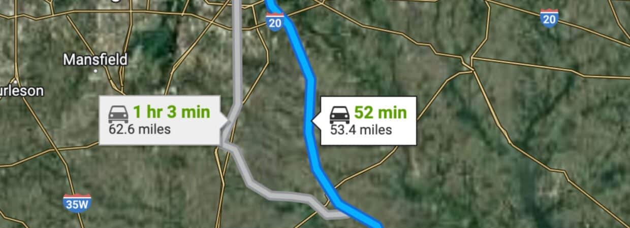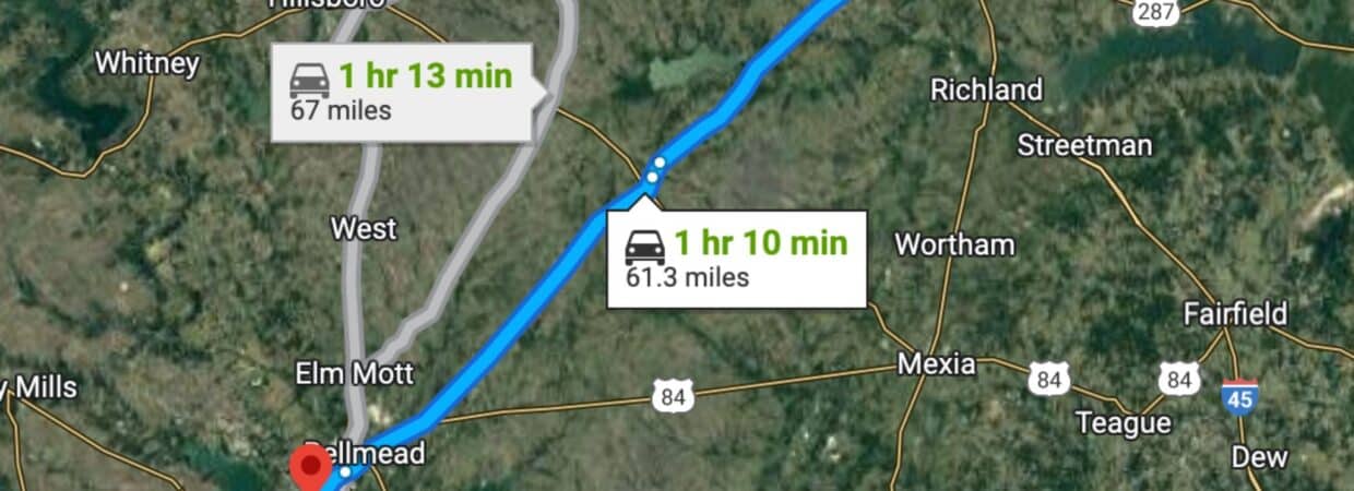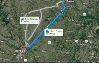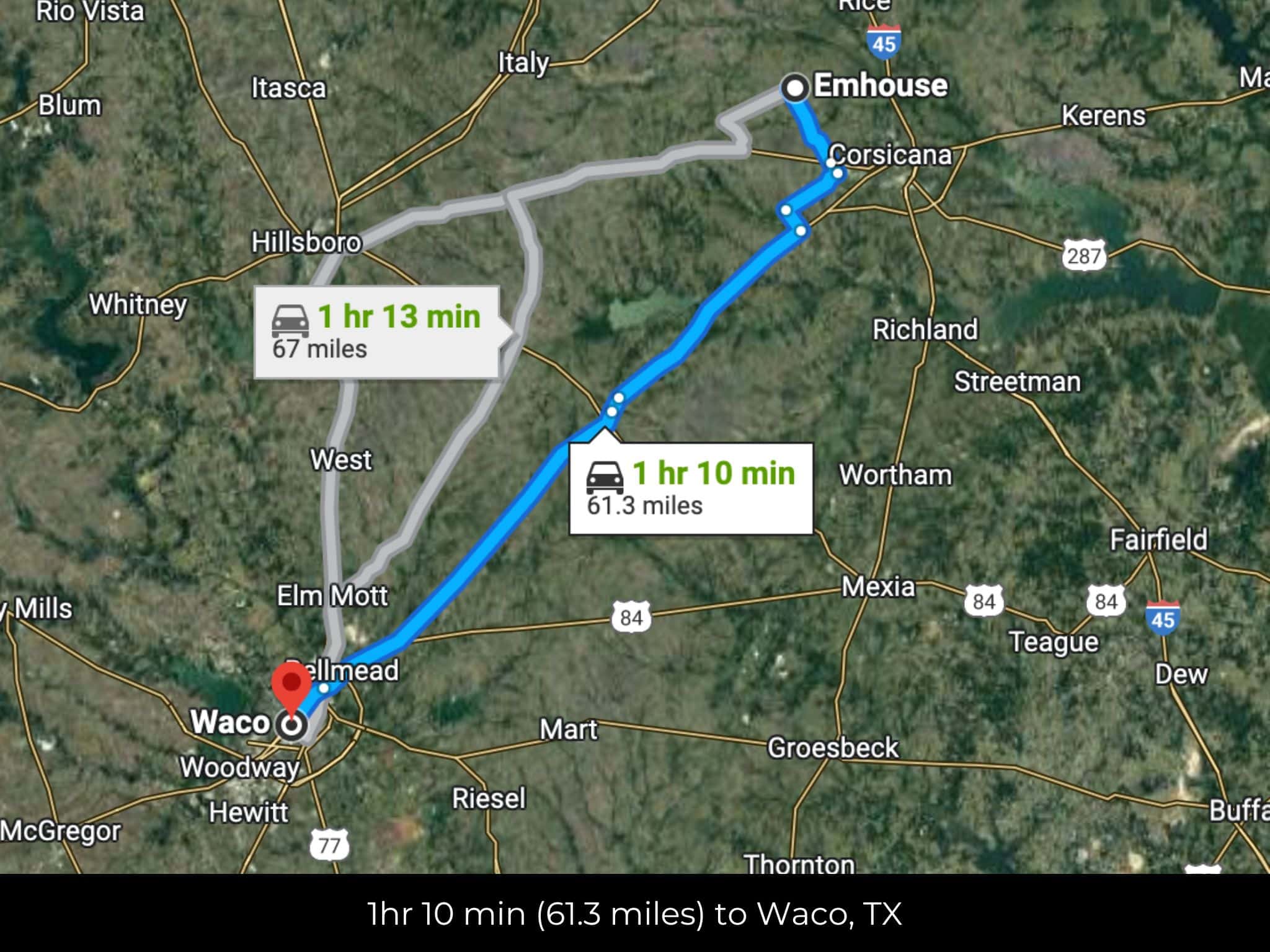 1 hr 8 min (61.4 miles) to Waco (about)