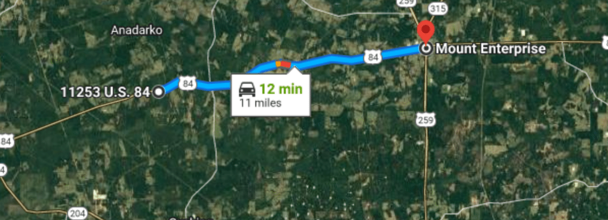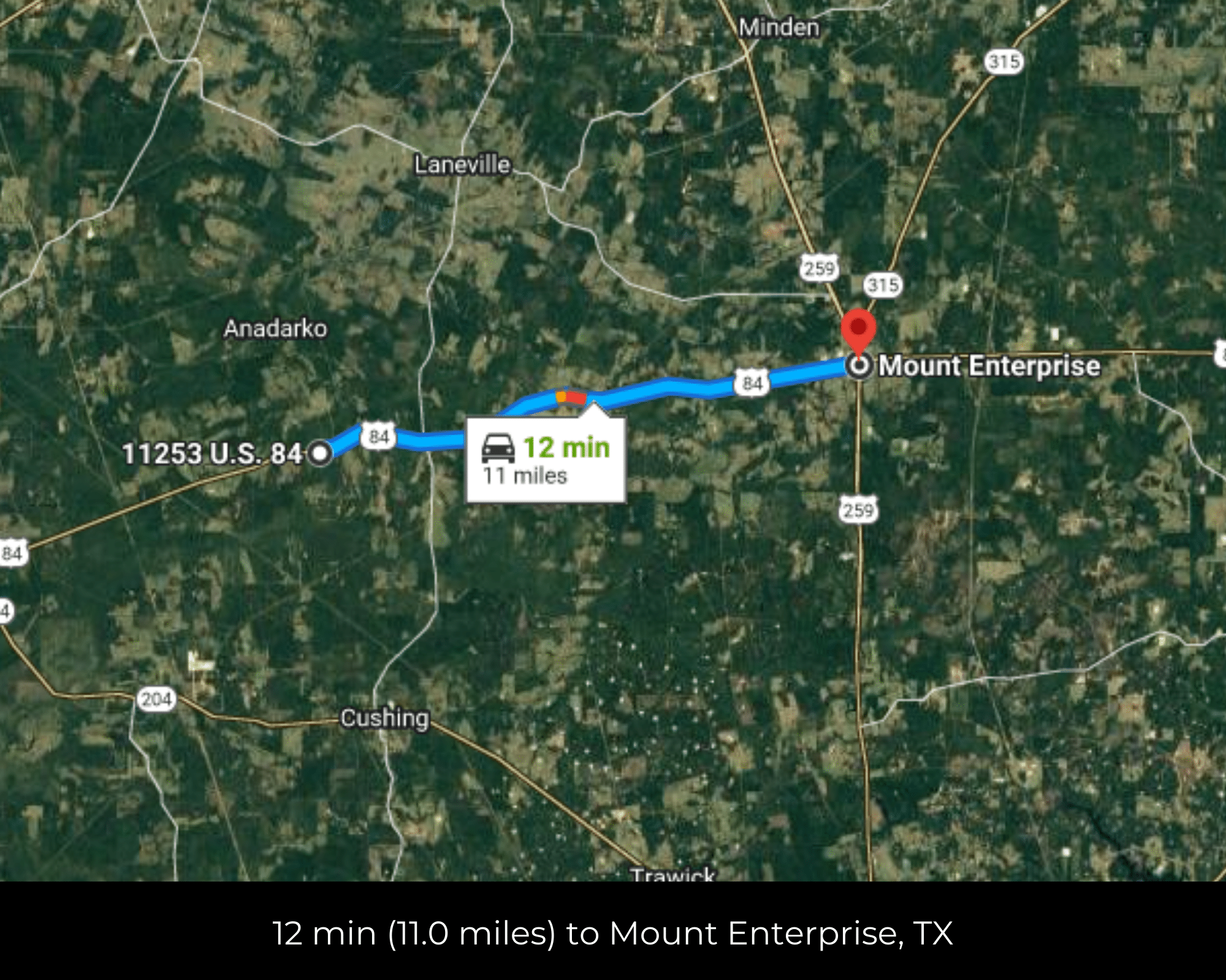 12 min (11.0 miles) to Mount Enterprise, TX Population: 436 (about)