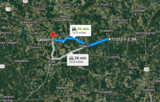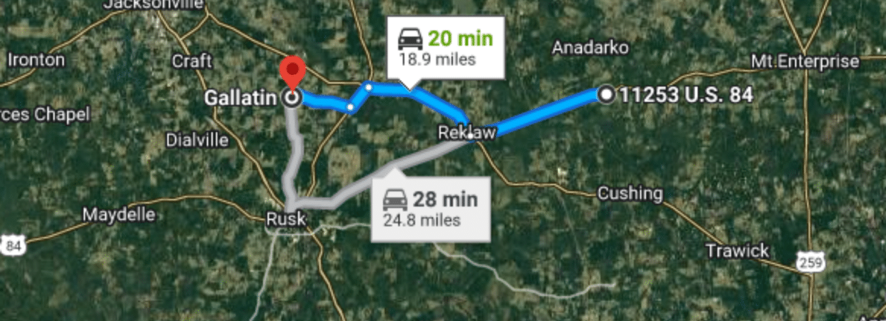 20 min (18.9 miles) to Gallatin, TX Population: 437 (about)