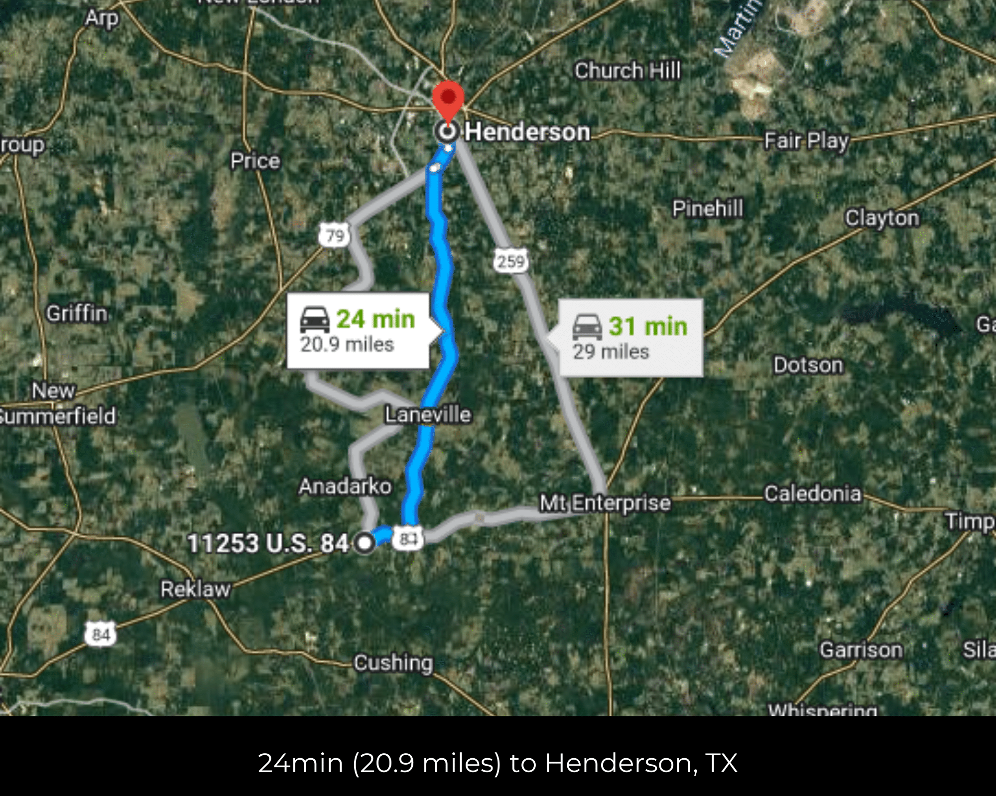 25 min (20.9 miles) to Henderson, TX Population: 13,109 (about)