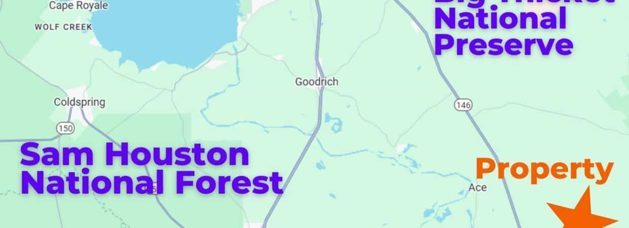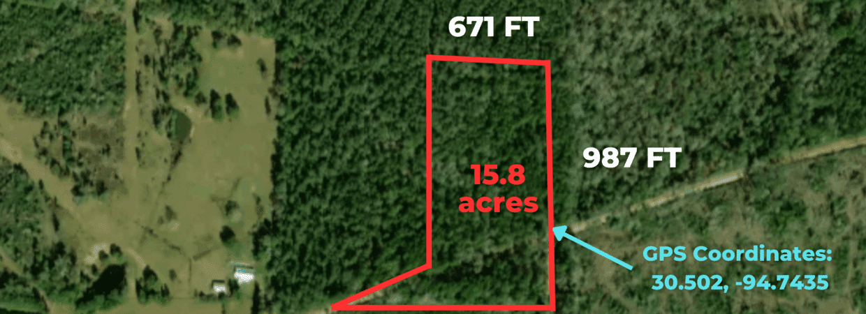 15.831 acres of open, unrestricted land in southern Polk County, TX — approximately 26 miles south of Livingston. Flat terrain, 150 ft elevation, no floodplain. Roughly 671×987 ft. Scattered trees on otherwise open ground. No HOA, no deed restrictions. Mobiles, barndominiums, tiny homes, RVs, and camping all permitted. Power available via Sam Houston Electric; water via private well or alternatives; fiber-optic internet accessible; septic or alternative needed for sewer. Whitetail, hog, and turkey country. Lake Livingston (~90,000 surface acres, second-largest lake in Texas) approximately 26 miles north; Lake Livingston State Park nearby. Big Thicket National Preserve (UNESCO Biosphere Reserve) in eastern Polk County. Martin Dies Jr. State Park ~40 miles east. Houston ~75 miles south; Beaumont ~47 miles. Annual taxes: $151.26. Warranty deed. No liens, no back taxes. GPS: 30.502, -94.7435. APN: 10071004500-2.