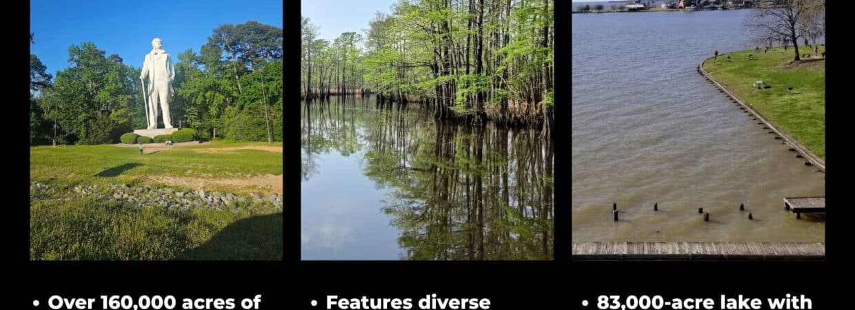 The surrounding country is serious East Texas — the outer edge of the Big Thicket, where loblolly pine, sweetgum, and Southern magnolia crowd the roadsides and whitetail, hog, and turkey have plenty of room to move. Lake Livingston — the second-largest lake within Texas borders, with over 90,000 surface acres — is about 26 miles north, with Lake Livingston State Park on its shores. Big Thicket National Preserve, a UNESCO Biosphere Reserve and one of the most biologically diverse places in North America, covers thousands of acres in Polk County's eastern reaches. Martin Dies Jr. State Park, on the edge of the Big Thicket at B.A. Steinhagen Lake, is roughly 40 miles east. The Alabama-Coushatta Tribe of Texas — whose ancestors settled this part of East Texas in the 1780s — still maintains their reservation here in Polk County.