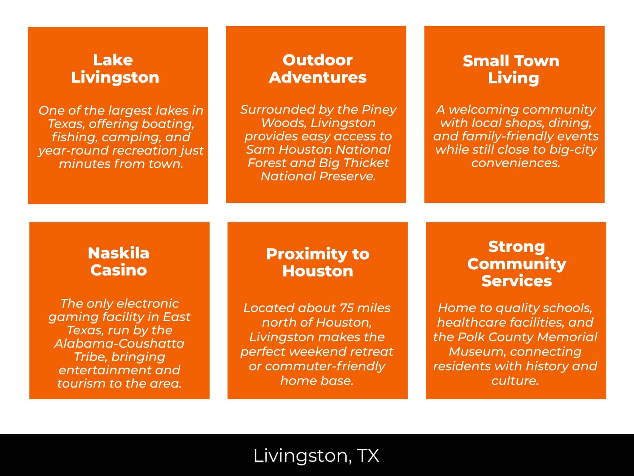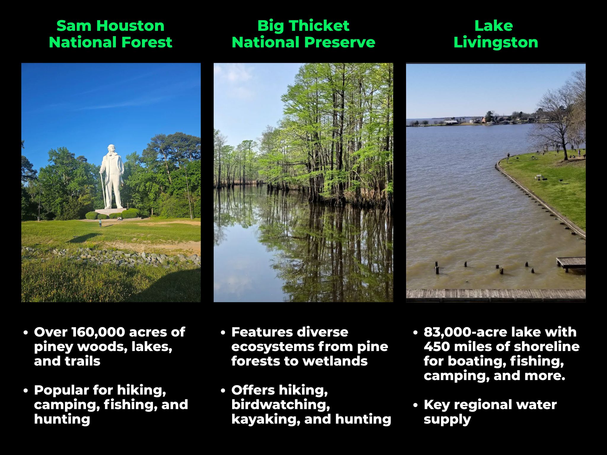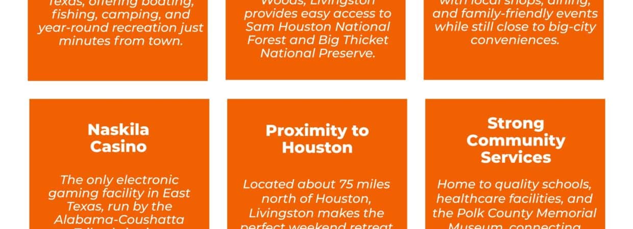 Livingston, Conroe, Beaumont, Houston