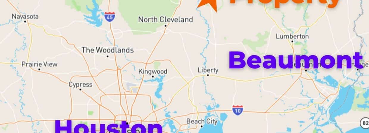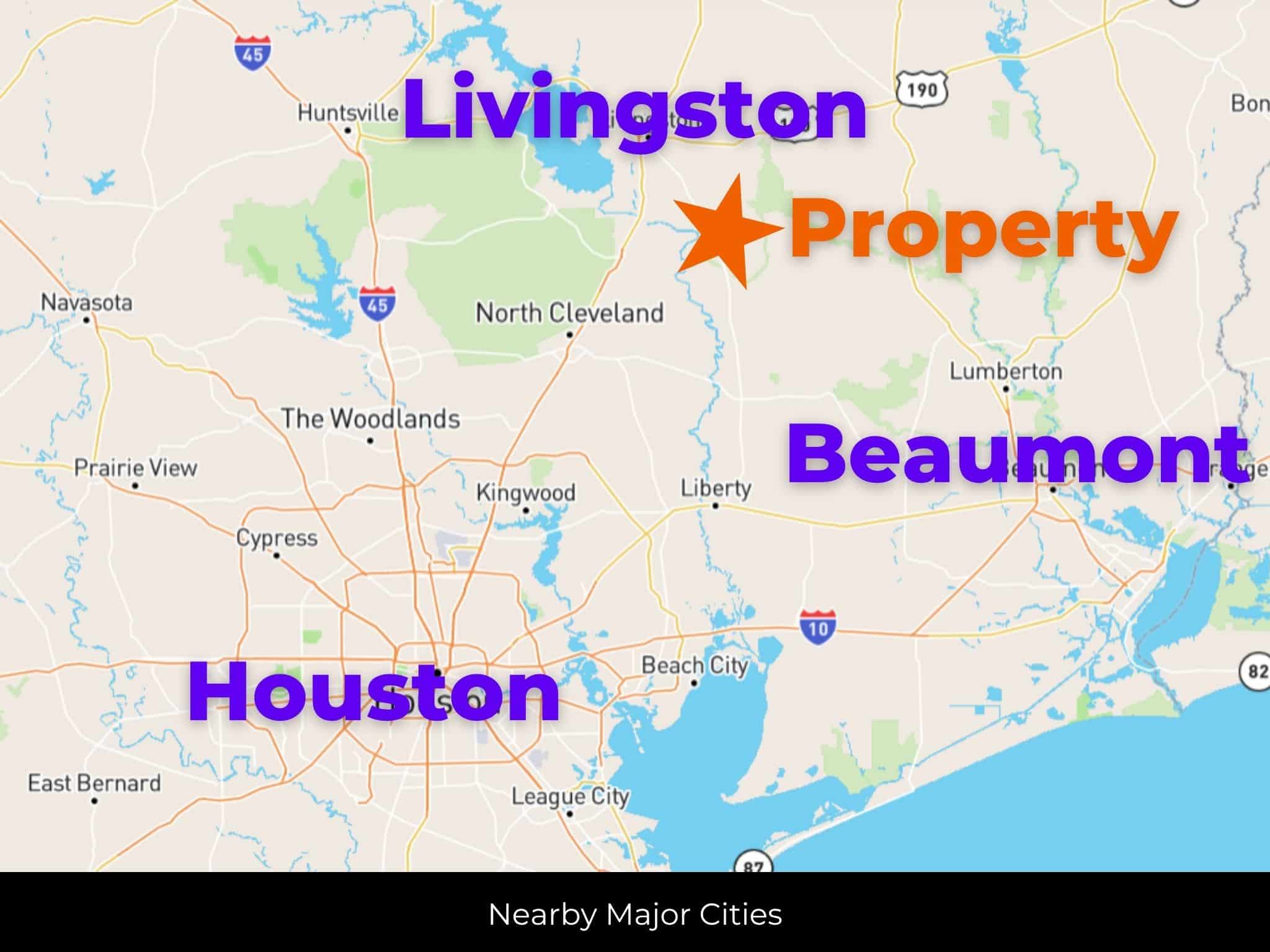 Houston is about 75 miles south. Beaumont is roughly 47 miles. Sam Houston State University is 44 miles west in Huntsville. Texas A&M is approximately 90 miles west in College Station.